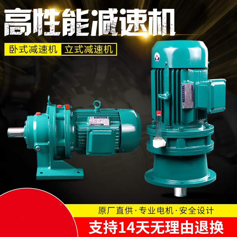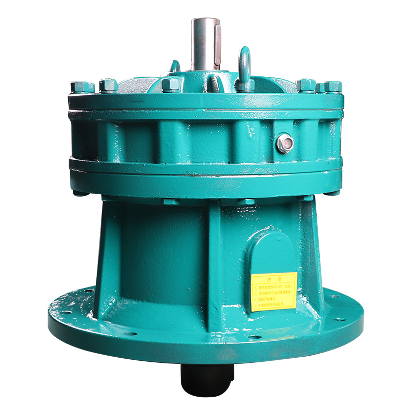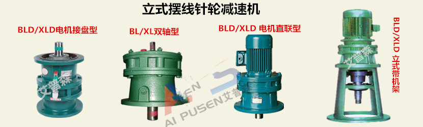 BL立式雙軸型擺線針輪減速機 第一、總述: 擺線針輪減速機全部傳動裝置可分為三部分:輸入部分、減速部分、輸出部分。在輸入軸上裝有一個錯位180的雙偏心套,在偏心套上裝有兩個稱為轉臂的滾柱軸承,形成H機構、兩個擺線輪的中心孔即為偏心套上轉臂軸承的滾道,并由擺線輪與針齒輪上一組環形排列的針齒相嚙合,以組成齒差為一齒的內嚙合減速機構,(為了減小摩擦,在速比小的減速機中,針齒上帶有針齒套)。當輸入軸帶著偏心套轉動一周時,由于擺線輪上齒廓曲線的特點及其受針齒輪上針齒限制之故,擺線輪的運動成為既有公轉又有自轉的平面運動,在輸入軸正轉周時,偏心套亦轉動一周,擺線輪于相反方向轉過一個齒從而得到減速,再借助W輸出機構,將擺線輪的低速自轉運動通過銷軸,傳遞給輸出軸,從而獲得較低的輸出轉速。